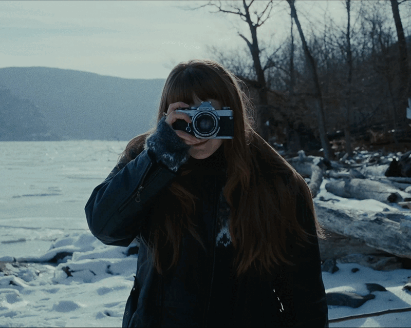 Woman in a black coat with a camera to her eye standing by a snowy lakeside with bare trees and mountains in the background.